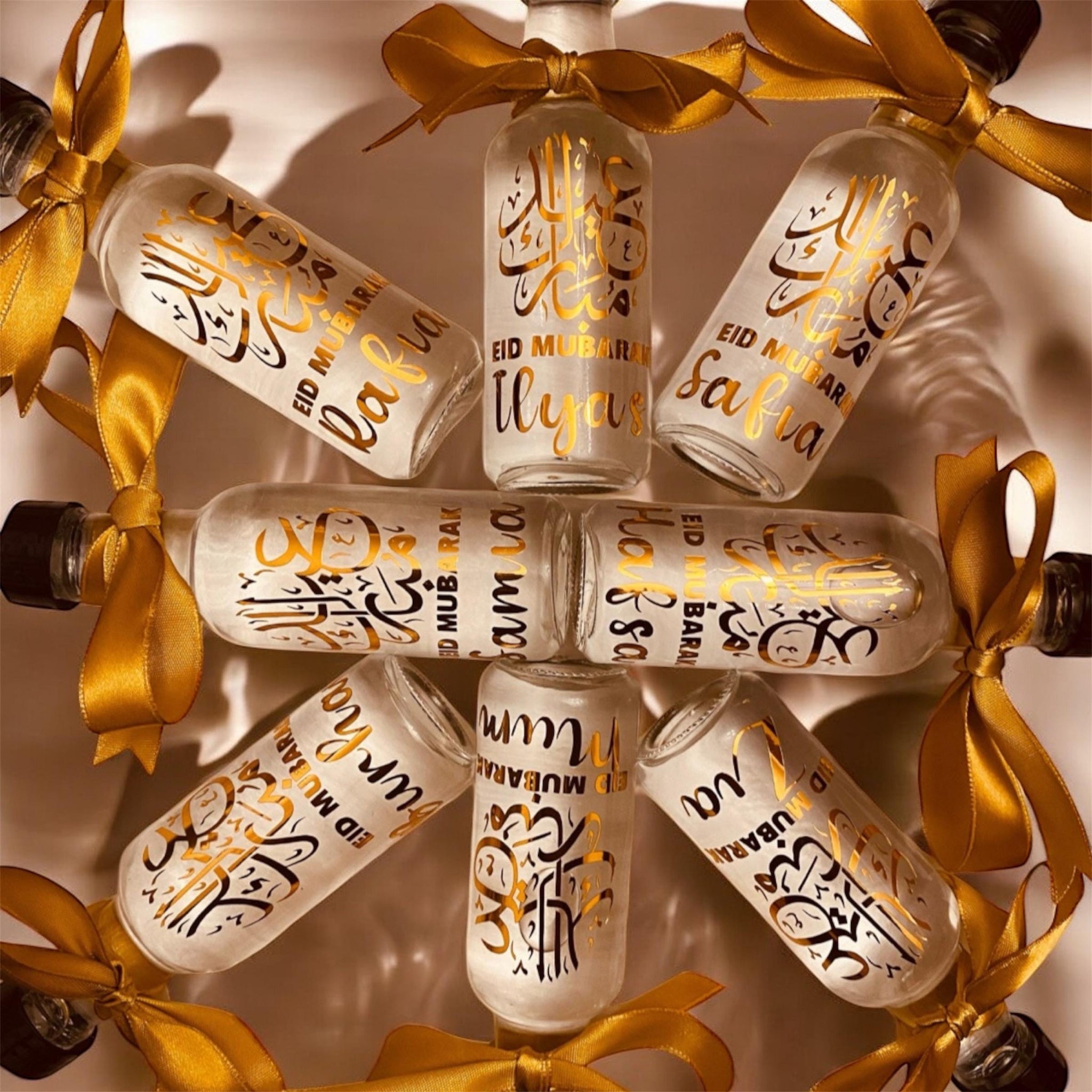 Our beautiful hand crafted design for wedding / Party any occassion Zam Zam Glass Bottles filled 50ml Zam Zam Water. We have a big range of vinyl colours for bottle / box text please specify in personalisation field.